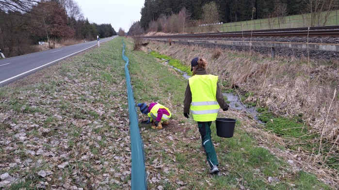 Unsere heimischen Amphibien haben es nicht einfach. Lebensraumschwund, zunehmende Trockenheit oder auch eingeschleppte Krankheiten wie der berüchtigte Chytrid-Pilz gehen auch an den Beständen von bisher sehr häufigen Arten nicht spurlos vorbei. Und jetzt im Frühjahr kommt auch noch der Straßenverkehr hinzu. Wie jedes Jahr beginnen v.a. Grasfrosch und Erdkröte mit den sogenannten Laichwanderungen vom Winterquartier zu den Teichen und Tümpeln. Und wenn eine Straße die beiden Teillebensräume trennt, wird es gefährlich für die kleinen Hüpfer. Schutz vor dem Straßentod bieten sogenannte Amphibienzäune, welche die Tiere bis zu eingegrabenen Fangeimern leiten. Einen solchen Zaun betreut die Fachgruppe Natur- und Umweltschutz der Kirchenlamitzer Naturfreunde schon seit mittlerweile über 25 Jahren zwischen Niederlamitz und Großwendern. Möglich geworden ist dies durch die enge Zusammenarbeit mit dem Landschaftspflegeverband Wunsiedel. Auch jetzt gerade sammeln die freiwilligen Helfer wieder täglich die gefangenen Tiere ein, um sie sozusagen im „Eimertaxi“ sicher über die Straße zum Teich zu bringen. „Grasfrösche und Erdkröten sind sogenannte „Traditionslaicher“, das heißt, sie kehren über viele Jahre immer wieder zum selben Gewässer zurück, um dort zu reproduzieren. Dabei lassen sie sich auch von einer Straße nicht aufhalten“ erklärt Naturschutzgruppenleiter Andreas Hofmann. Problematisch ist, so die Naturschützer, dass die Tiere nicht einmal unbedingt direkt von den Reifen erfasst werden müssen. Der Druckunterschied unter einem Auto, dass schneller als 30 km/h fährt, lässt meistens die inneren Organe der Tiere platzen. Aber auch die Helfer selbst haben einen nicht ungefährlichen Job an der vielbefahrenen Verbindungsstraße. Deshalb runter vom Gas sobald man den grünen Zaun und die signalgelben Warnwesten der Zaunbetreuer am Straßenrand sieht. „Es gäbe noch so viele Stellen, an denen solche Schutzmaßnahmen notwendig wären. Erfreulicherweise sind wir tatsächlich nicht mehr die einzigen Zaunbetreuer im Landkreis, das war viele Jahre lang so. Mittlerweile stehen auch bei Weißenstadt, Thierstein und Fahrenbach mobile Schutzzäune. Das macht Mut, dass vielleicht zukünftig noch mehr dazu kommen könnten“ so Hofmann.
