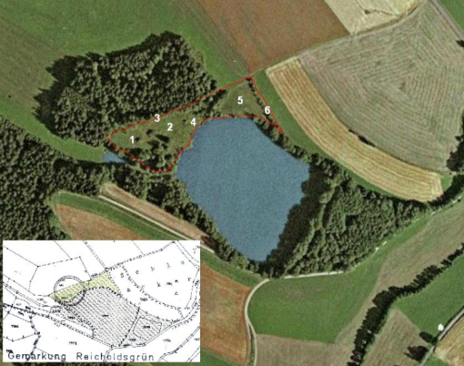 Das Grundstück bildet das nordwestliche Ufer des Weihers. Die Verlandungszone geht hier in ein Kleinseggenried (Braunseggensumpf [Caricetum fuscae] ) über. Im Bewuchs herrscht hier neben den erwähnten Seggen auch noch das schmalblättrige Wollgras (Eriophorum angustifolium) vor. An seltenen und geschützten Arten kommen das breitblättrige Knabenkraut (Dactylorhiza majalis / Rote Liste 3,§) und im Bereich der sehr nassen Stellen auch Fieberklee (Menyanthes trifoliata / §), Moosbeere (Vaccinium oxycoccos / Rote Liste 3) und Sumpfcalla (Calla palustris / Rote Liste 3,§) vor. Im vorderen Teil des Grundstücks findet man den großen Klappertopf (Rhinanthus serotinus agg. / Rote Liste 3) sowie einen sehr starken Bestand an Arnika (Arnica montana / Rote Liste 3,§). Teile des Kleinseggenriedes sind locker mit Schilf (Phragmites communis) überstellt, z.T. ist auch ein Verlandungsbereich mit Rohrkolben (Typha latifolia) vorhanden. Der Weiher und somit auch das Ufergelände ist Rastplatz z.T. seltener Wasservogelarten und Lebensraum verschiedener Libellen - und Amphibienarten, sowie Reptilien und verschiedener Spinnen. Besonders erwähnenswert sind hier unterschiedliche Kreuzspinnenarten und die Wespenspinne. Möglicherweise fliegt auf der Fläche auch der Abbiß-Scheckenfalter (Euphydryas aurinia) - RL Deutschland 2 - Eine direkte Beobachtung konnte leider noch nicht gemacht werden, doch durch die relativ starke Verbreitung der Futterpflanze Teufelsabbiß (Succisa pratensis) kann ein Vorkommen auf der Fläche nicht ausgeschlossen werden. Entsprechend werden dahingehend auch Pflege- und Fördermaßnahmen unternommen.