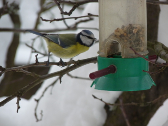verschmutzen. Besser sind handelsübliche Futterautomaten bei denen die Vögel nicht direkt mit dem Futter in Berührung kommen, sondern die Körner nur herauspicken können. Auch Meisenknödel sind in